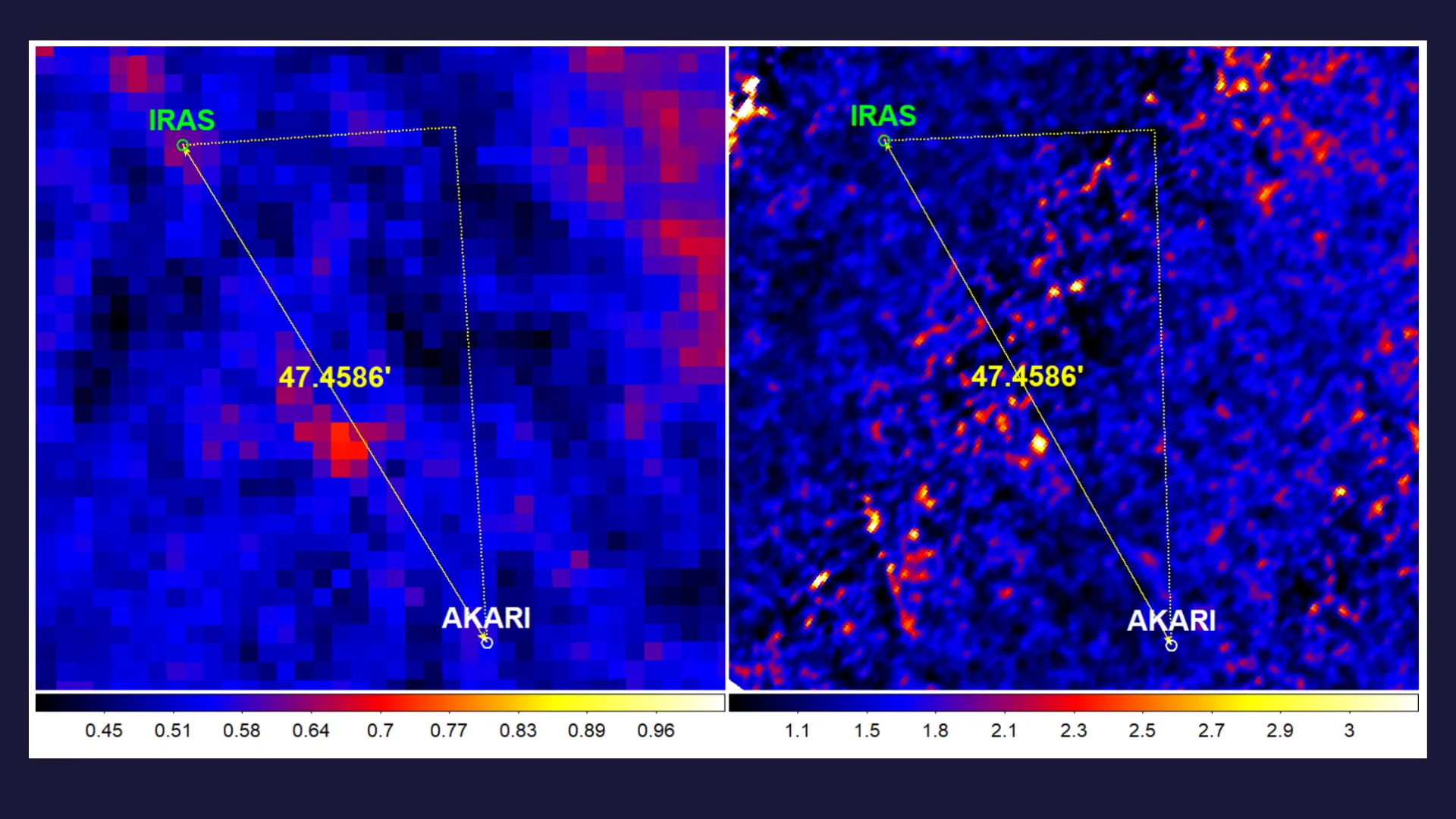 የእ.ኤ.አ. 1983ቱን የ 'IRAS' (በግራ) እና የእ.ኤ.አ. 2006ቱን የ 'AKARI' (በቀኝ) የሳተላይት ምስሎች በማነፃፀር የተገኘውን አስተማማኝ የዘጠነኛ ፈለክ እጩ የሚያሳይ ምስል። አረንጓዴው ክብ የቀድሞውን (IRAS) መገኛ ሲያሳይ፣ ነጩ ክብ ደግሞ አዲሱን (AKARI) መገኛ ይጠቁማል (የእያንዳንዱ ክብ ስፋት 25 አርክ-ሰከንድ ነው)። በመሃል ያለው ቢጫ መስመር፣ አካሉ በ23 ዓመታት ውስጥ ያደረገውን የርቀት ለውጥ (በአርክ-ደቂቃ) ያሳያል። ከስር ያለው የቀለም መለኪያ የሙቀት መጠኑን (በMJy/sr) የሚያመለክት ሲሆን፣ በቀኝ በኩል ባለው ምስል ላይ አካሉ በግልጽ የማይታየው መረጃው የተወሰደው "ወርሃዊ ማረጋገጫ" ከሌላቸው ተንቀሳቃሽ አካላት መዝገብ (AKARI-MUSL) በመሆኑ ነው።