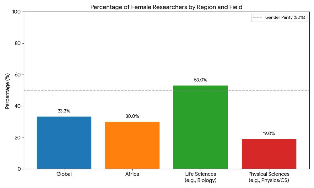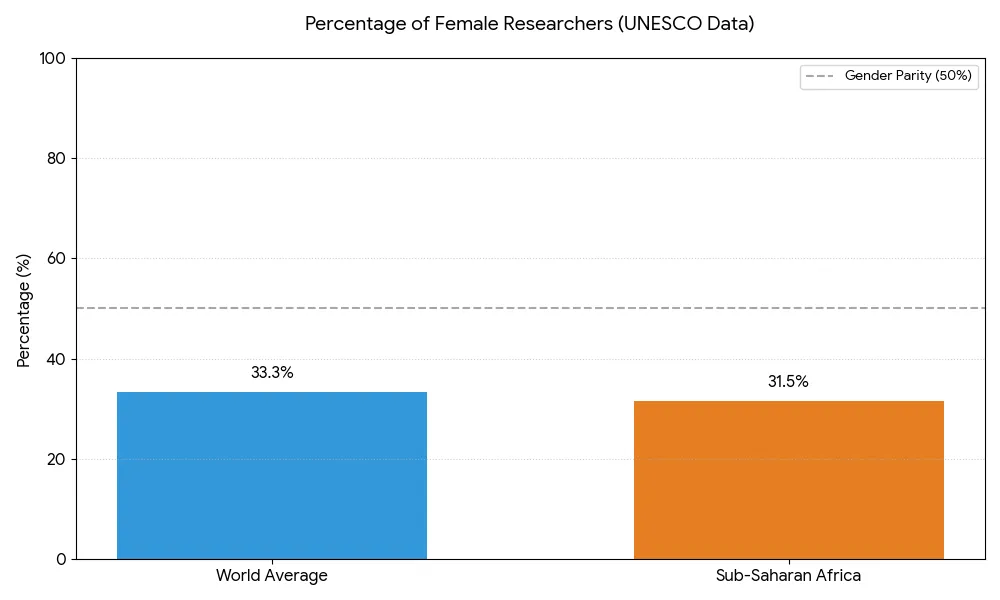 በዩኔስኮ (UNESCO) መረጃ መሠረት በሰሃራ በታች ባሉ የአፍሪካ አገራት ያለውን የሴት ተመራማሪዎች ድርሻ (31.5%) ከዓለም አቀፍ አማካይ እና ከሚፈለገው የእኩልነት ደረጃ (50%) ጋር በማነፃፀር የሚያሳይ ግራፍ