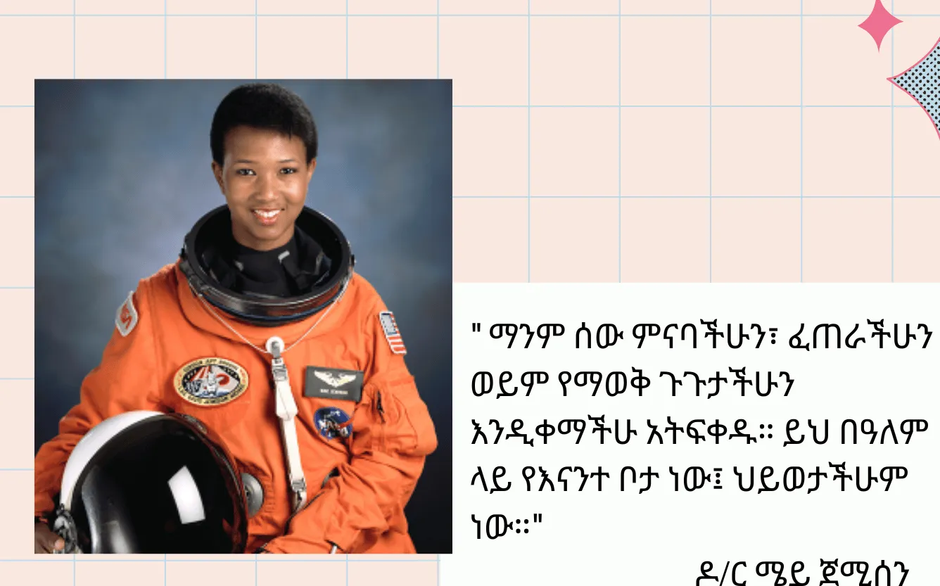 "ማንም ሰው ምናባችሁን፣ ፈጠራችሁን ወይም የማወቅ ጉጉታችሁን እንዲቀማችሁ አትፍቀዱ። ይህ በዓለም ላይ የእናንተ ቦታ ነው፤ ህይወታችሁም ነው።" ዶ/ር ሜይ ጀሚሰን (ወደ ጠፈር የሄደች የመጀመሪያዋ ጥቁር አሜሪካዊት)