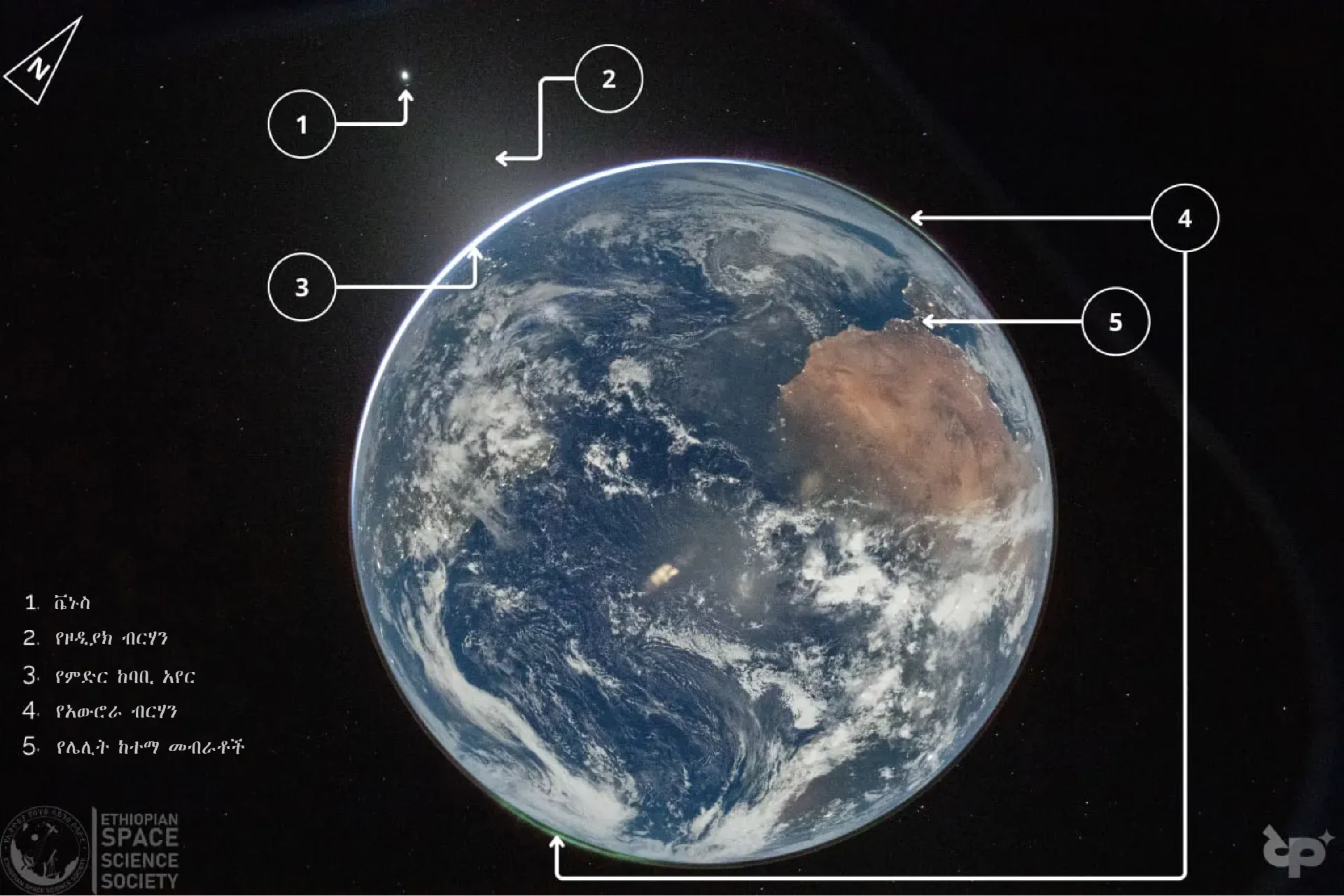 የአውሮራ ብርሃን፡- በምድር የላይኛው ቀኝ እና የታችኛው ግራ ጠርዝ ላይ በግልጽ የሚያበሩ።